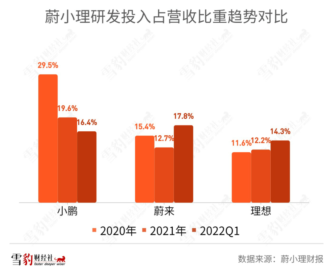 从2020年至2022年二季度,理想研发投入占营收的比重从11.6%一路增长至17.5%,是“蔚小理”中唯一稳步增长的。