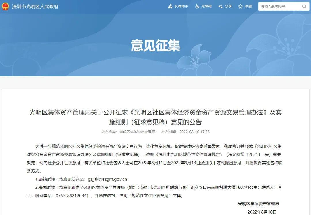 据“深圳市城市更新网”消息,近日,光明区集体资产管理局发布公开征求《光明区社区集体经济资金资产资源交易管理办法》及实施细则意见公告。