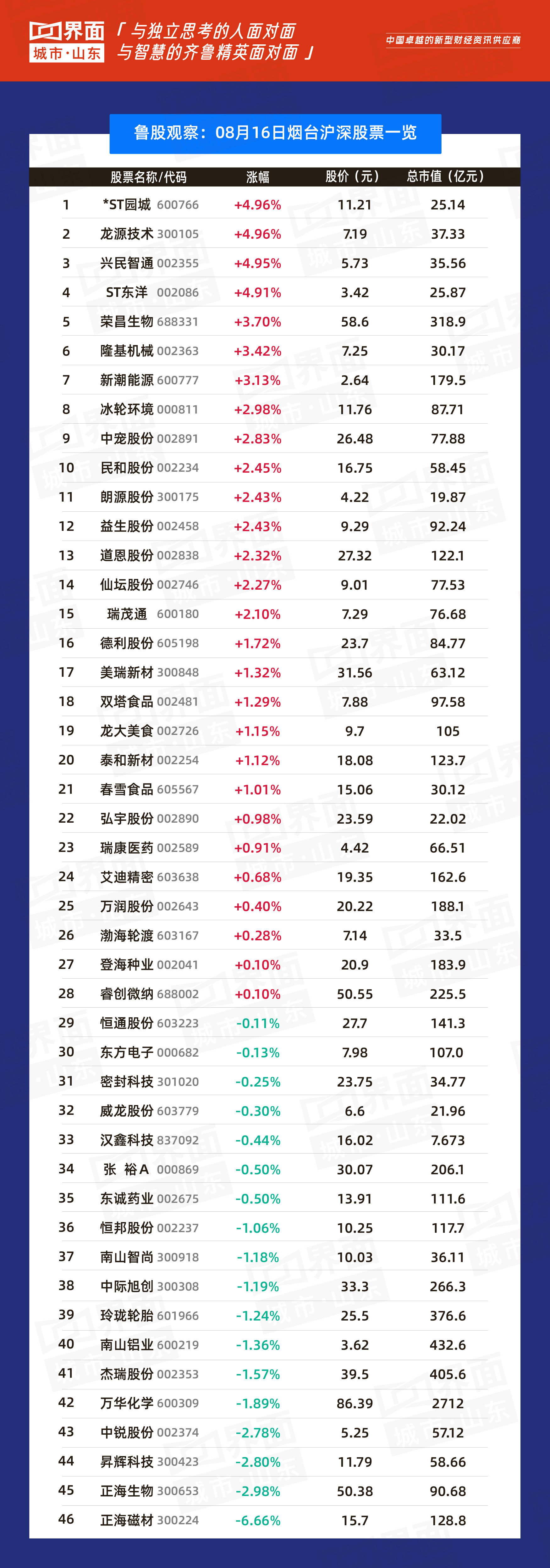 烟台市涨幅榜首: *ST园城(600766),涨幅4.96%,股价11.21元,总市值 25.14亿元;