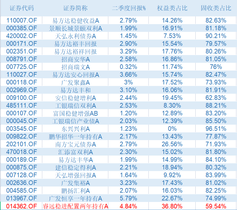 界面新闻统计了上述25只基金发现,截至二季度末,除了东兴兴利股票仓位为0外,其余产品均配置了一定比例的股票仓位。其中,睿远稳进配置两年持有股票仓位占比最高,为36.8%。