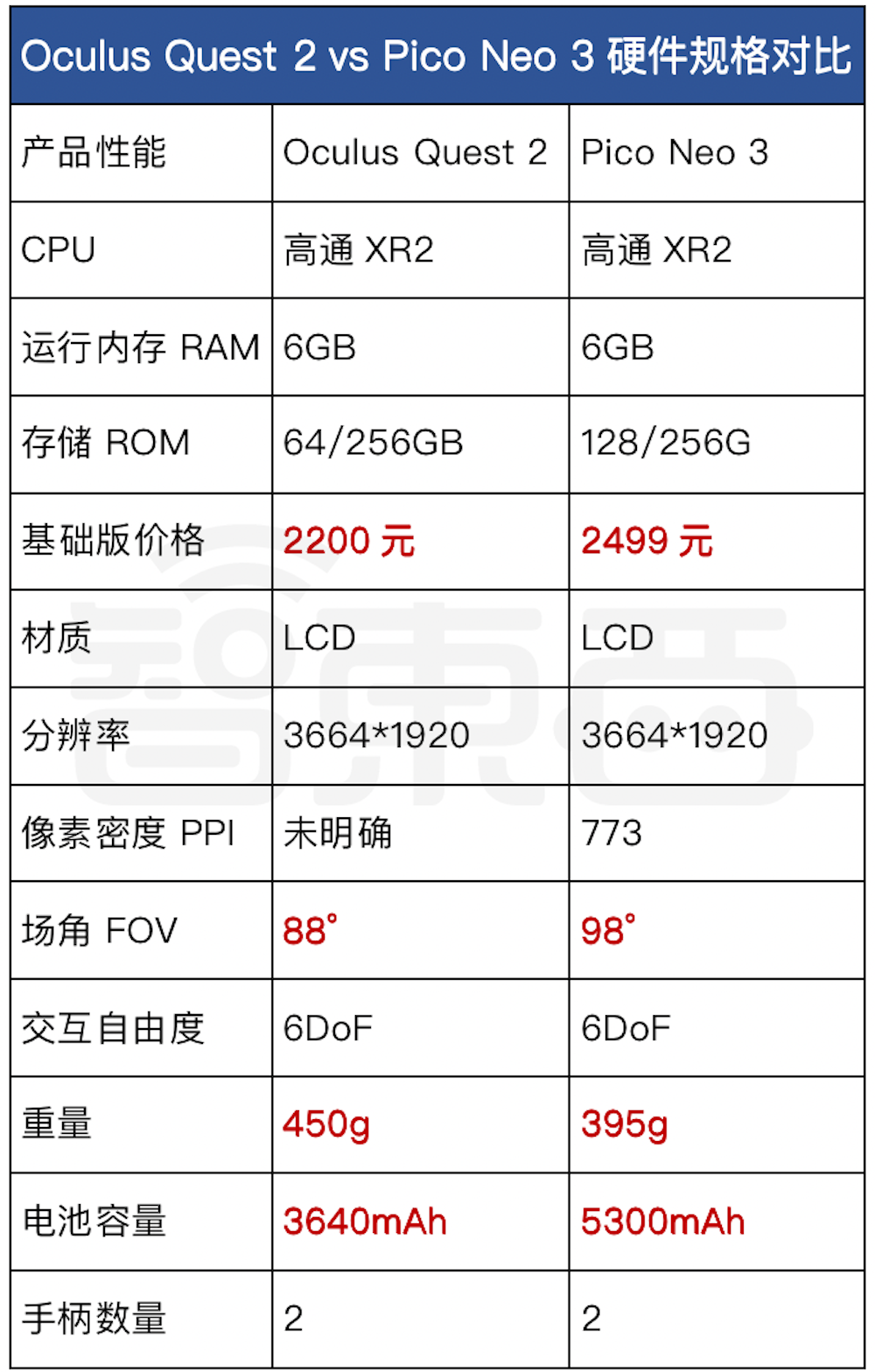 ▲涨价之前,Oculus Quest 2 vs Pico Neo 3硬件规格对比