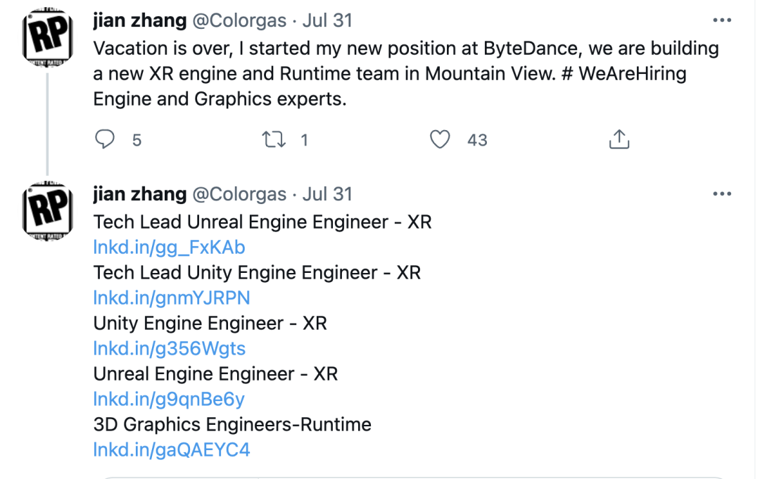 此前外媒曾报道,曾任Meta软件高级工程师的Jian Zhang已经跳槽至字节跳动,并为字节跳动旗下的VR头显品牌Pico建立新团队。Jian Zhang还在推特发文,“我们正在山景城建立一个新的XR引擎和运行团队。”