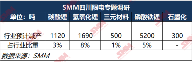 据上海有色网SMM数据统计,此次限电预计影响四川当地的锂盐、三元材料、磷酸铁锂、石墨化等多个领域,其中碳酸锂、氢氧化锂、三元材料、磷酸铁锂、石墨化预计分别减产1120吨、1690吨、500吨、5200吨、300吨,占行业比重1%-8%不等。