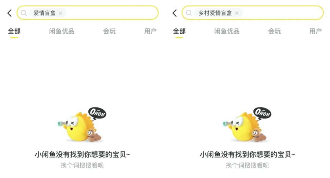闲鱼主要是通过不断将违禁商品相关词汇和暗语划入违禁词,对商品进行审核、屏蔽和下架。暗语多是普通词汇,不断将这些普通词汇划入违禁词库,正常商品的曝光就无可避免地受到影响。例如有色情服务将暗语设置为“爱情盲盒”,当闲鱼将此暗语划入违禁词库后,含有该词汇的“乡村爱情系列盲盒”这一词条也无法检索,相关商品自然没有曝光量。