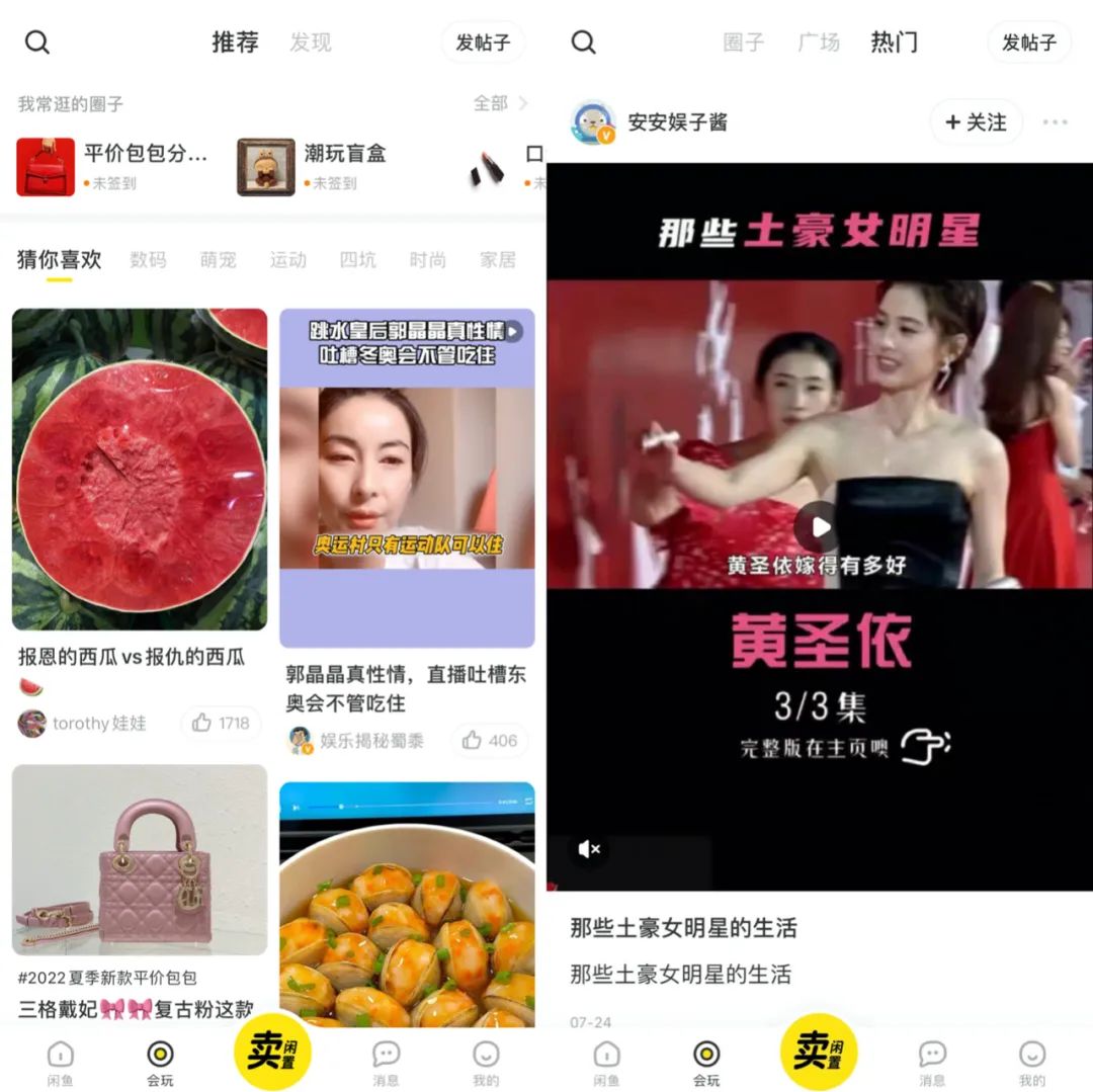 但8月上旬,闲鱼突然大范围整改了会玩版块,将热门栏(短视频推荐流)砍掉,短视频内容融入图文内容,合并为推荐栏,原圈子栏则改为发现栏。这一大改动,说明闲鱼已经发现,会玩版块以往试图以短视频、图文多线并行,以促进转化的路径效果有限。闲鱼社区需要流量去中心化,即向小红书看齐。
