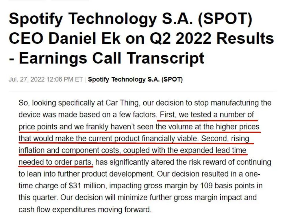 7月27日,在Spotify的第二季度财报电话会议上,其首席执行官Daniel Ek专门针对停产Car Thing进行了说明,指出停产该设备主要有三个因素:定价、通货膨胀和供应链困难。