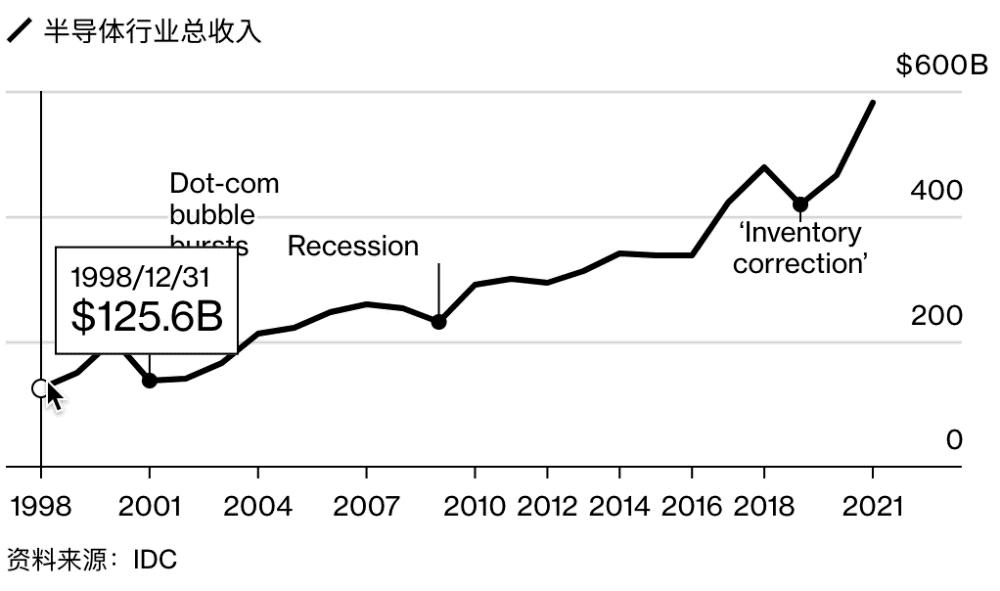 ▲1998年-2021年半导体行业总收入变化(图源:彭博社)