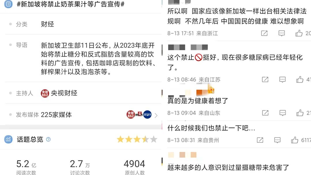 上周日,一则“新加坡将禁止奶茶果汁等广告宣传”的话题,冲上微博热搜,阅读量超过5亿,评论区纷纷力挺,甚至还有人建议引入国内。