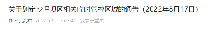 8月17日,沙坪坝区新型冠状病毒肺炎疫情防控指挥部发布通告,自2022年8月17日0时起,在沙坪坝区内划定相关临时管控区域。