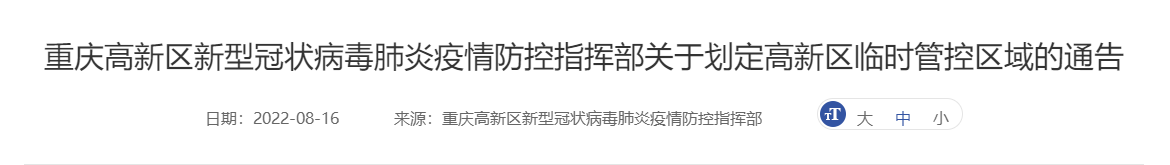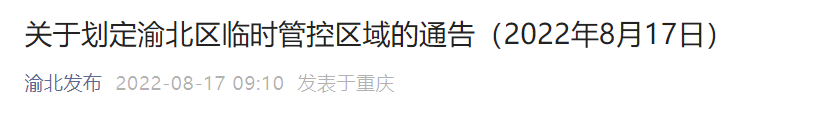 8月17日,渝北区新型冠状病毒肺炎疫情防控工作指挥部发布通告,自2022年8月17日起,在辖区内划定临时管控区。
