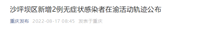 8月17日,沙坪坝区新型冠状病毒肺炎疫情防控指挥部发布关于沙坪坝区新增2例无症状感染者(无症状感染者7、8)在渝活动轨迹的通告。