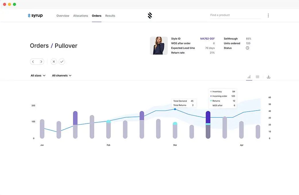 Syrup Tech技术上的特别之处,在于可以提供商品经销相关所有数据,如交易、营销和库存,并将其与其他数据(如社交媒体趋势甚至天气)相结合,以使用AI提供预测性库存建议和机器学习。通过这种方式,采购员和规划人员可以更好地了解他们的需求,并且可以减少一些浪费。