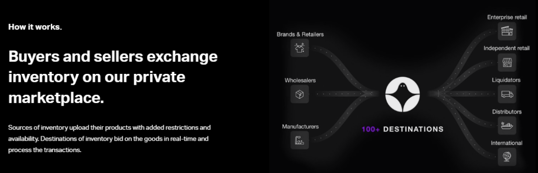 Ghost的商业模式,在于在库存领域创建了一个类似于eBay的市场,供应商在其中列出他们的产品,包括SKU信息、可用性、数量和描述,然后买家可以对货物进行投标。供应商们通过平台可以自动发布、销售和运输未售出库存,信誉良好的卖家还可以立即收到付款。
