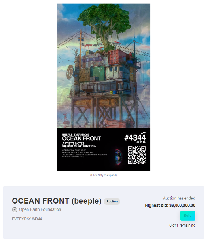他没抢下《Everydays: The First 5000 Days》,于是拍下了Beeple的另一个作品《OCEAN FRONT》,这也花了600万美元。