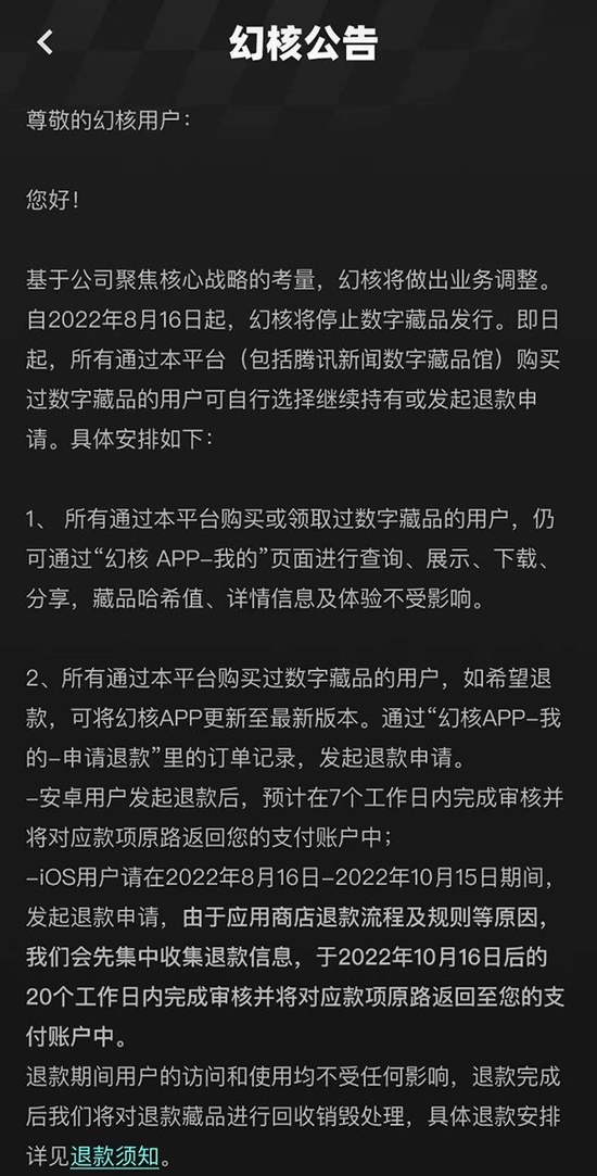然而就是在这样的热潮之下,8月16日,腾讯旗下幻核公告称,将停止数字藏品发售。