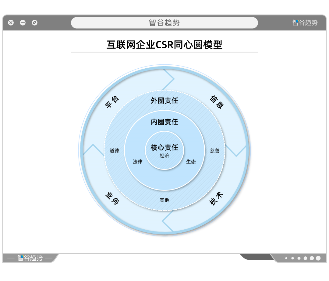 内圈,是体现企业商业属性的经济责任;中圈,是对企业利益相关者产生影响所承担的法律责任;外圈,是主动或依据社会期待所承担的道德责任。