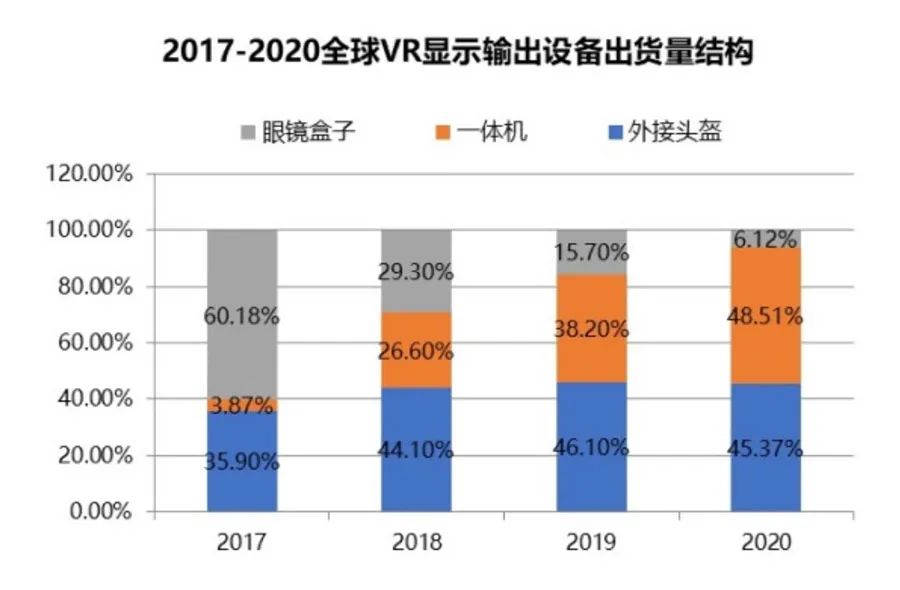 显示输出设备是人们进入虚拟世界的入口,也是VR产业的核心终端设备和主流产品。从产品演进看,早期的VR眼镜日渐退出市场,而VR一体机、外接头戴显示等高端产品更新加速,逐步为市场所接受,成为市场主流,目前,显示输出设备已步入放量增长期。