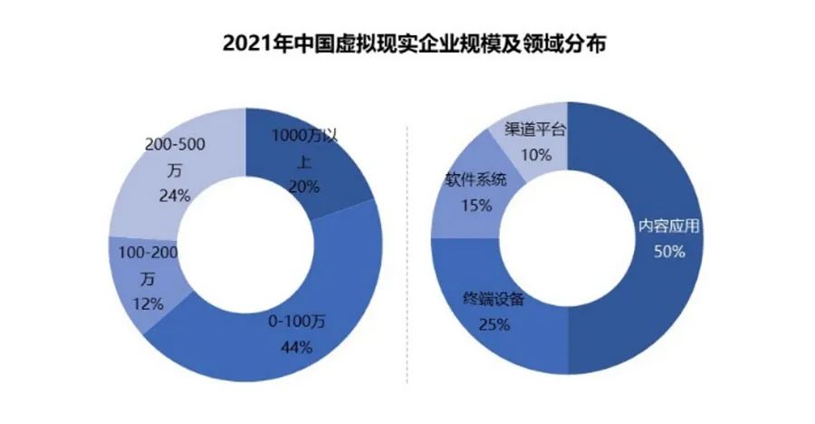 由于应用场景众多,VR市场呈现碎片化的发展格局,中小创业企业混战竞争,应用端的垄断尚未形成。从主体类型看,小微创新主体不断涌入,倾向于从应用端切入。2021年我国VR企业有近1.9万家,增长约52%,其中近8成的企业成立不超过5年,80%企业投资规模低于500万。从布局领域上看,内容应用企业占比50%,位居第一。