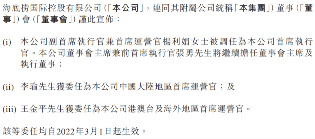 2022年3月1日,海底捞发布管理层人事任命公告。杨利娟从副CEO升任CEO,负责监督集团的管理及战略而发展,并继续负责“啄木鸟计划”的落实与推进。