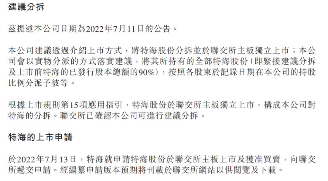 7月11日,海底捞发布公告,称考虑将特海股份进行实物分派方式的分拆,并以介绍上市方式于港交所主板单独上市的可能性。在完成建议分拆后,特海将不再为海底捞的附属公司。