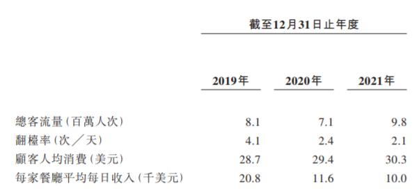 此外海外门店的整体翻台率,也从2019年的4.1次/天下降至2022年一季度的2.4次/天。而同期内地餐厅的翻台率则为3次/天。这也导致特海的单店日收入从2.08万美元,下降了一半至1万美元。