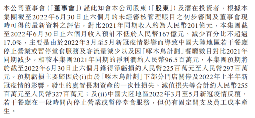 一是国内新冠疫情反复,在今年上半年有若干餐厅在一段时间内停止营业或暂停堂食服务,固定开始和员工成本挤压利润。