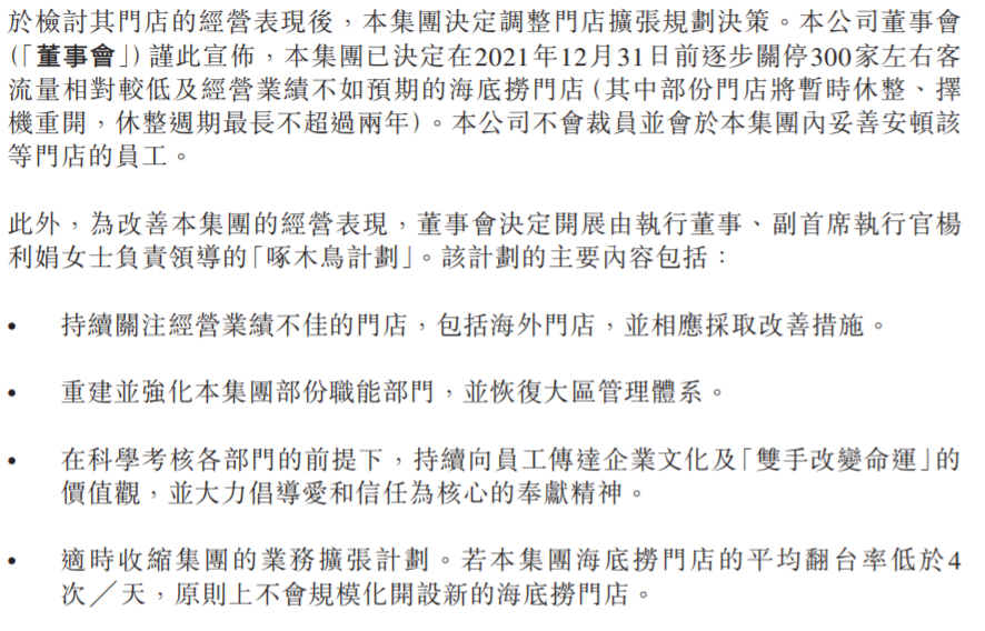 另一方面,则是因为在“啄木鸟计划”下,海底捞部分门店关停以及处置长期资产导致的一次性损失、减值损失。这一部分约合人民币2.55亿元至3.27亿元,是此次亏损的最重要原因。