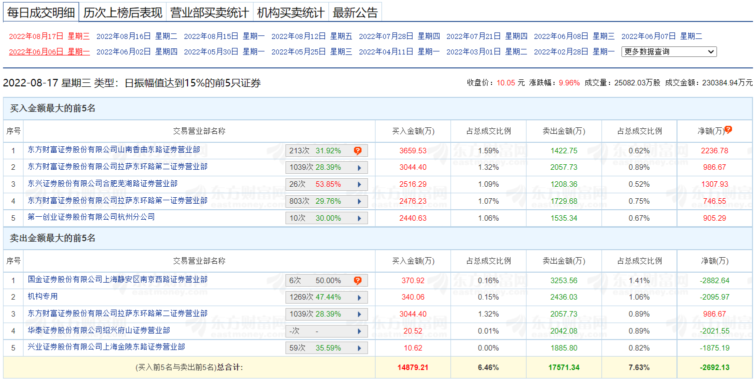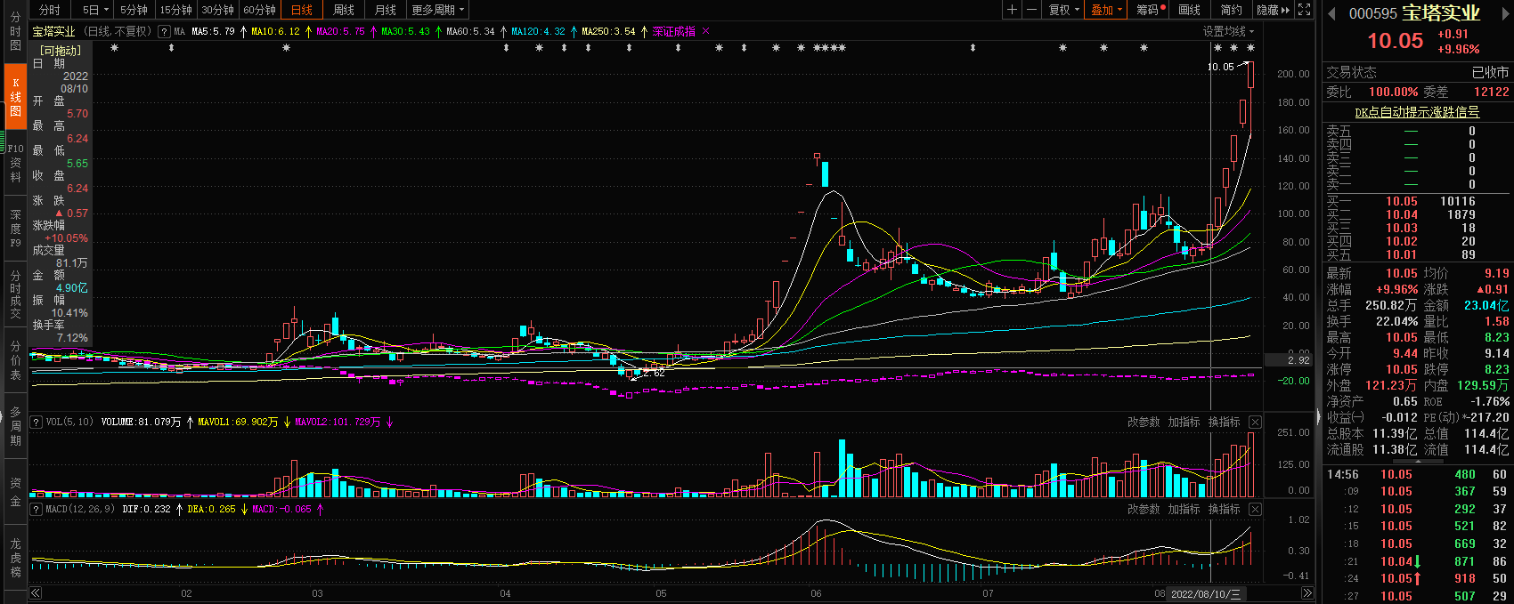 自8月10日至8月17日,宝塔实业在连续6个交易日内均实现涨停,股价由5.67元/股直接站上10元大关,阶段性涨幅达77%。