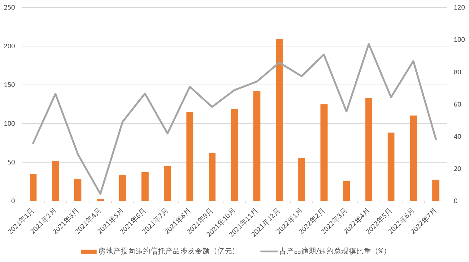 用益信托数据显示,2021年下半年以来,发生逾期、违约的信托产品规模中,地产信托长期占据半数以上,并且2021年8月、10月、12月以及2022年2月、4月、6月的房地产信托违约规模都在100亿元以上。