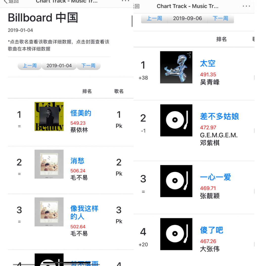 也就是说,Billboard中国榜曾短暂地存在过。2019年,Billboard中国与尼尔森网网联达成合作,发布“中国公告牌音乐榜单”和建立音乐渠道认证体系,意图以大数据驱动中国音乐产业发展。当年1月至9月,Billboard曾推出为期34期的Billboard中国榜。其中,首期top5为蔡依林《怪美的》、毛不易《消愁》《像我这样的人》、张艺兴《梦不落雨林》以及罗志祥《No Joke》;最后一期top5为吴青峰《太空》、邓紫棋《差不多姑娘》、张靓颖《一心一爱》《解忧》、大张伟《傻了吧》。九个月后,这一榜单便没了下文。