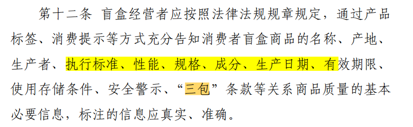 对此,《指引》对盲盒标签信息等提出了明确要求。譬如,通过产品标签、消费提示等方式充分告知消费者盲盒商品的名称、产地、生产者、成分、生产日期、有效期限、使用存储条件等关系商品质量的基本必要信息,标注的信息应真实、准确。