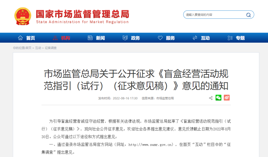 为引导盲盒经营者诚信守法经营,国家市场监管总局于昨日发布《盲盒经营活动规范指引(试行)(征求意见稿)》(下称《指引》),向社会公开征求意见。