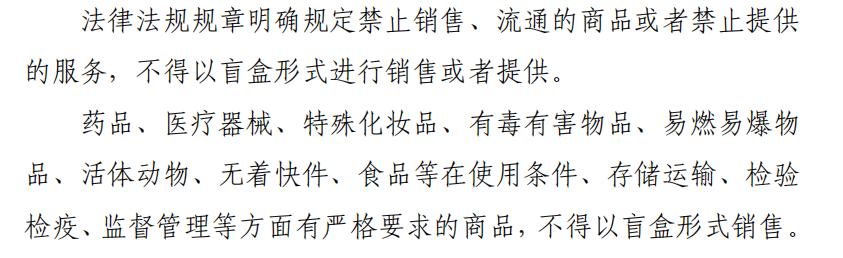 其中,国家市场监管总局明确指出,药品、医疗器械、特殊化妆品、有毒有害物品、易燃易爆物品、活体动物、食品等在使用条件、存储运输、检验检疫、监督管理等方面有严格要求的商品,不得以盲盒形式销售。