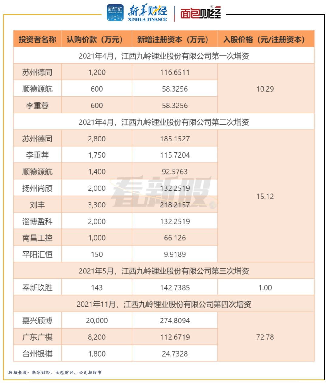 截至2022年6月20日,魏冬冬、魏绪春、潘蕊合计控制公司57.8645%的股份,为公司实际控制人,股权相对集中。数据显示,2021年4月至11月,变更为股份公司后的九岭锂业先后完成了四次增资。