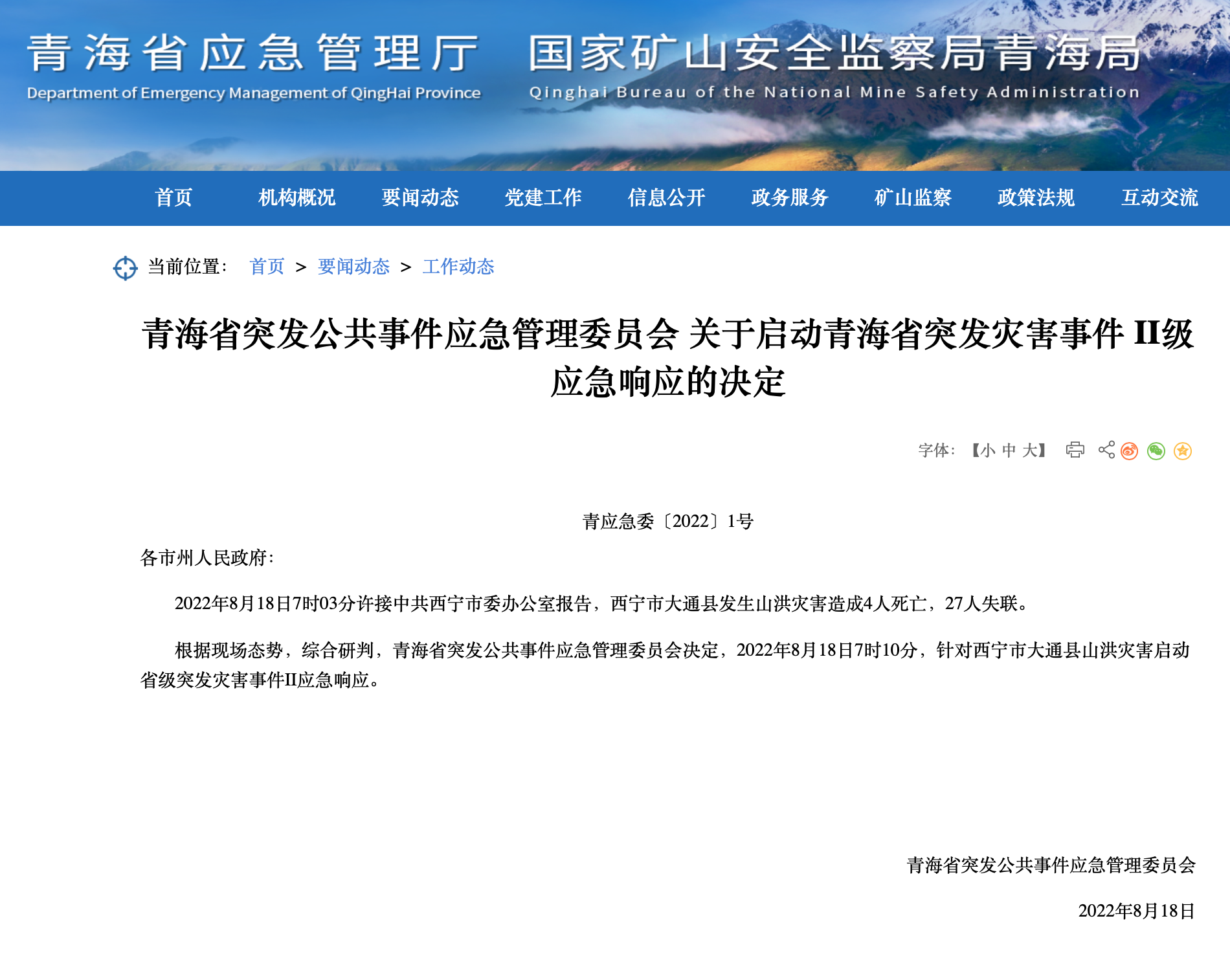 根据现场态势,综合研判,青海省突发公共事件应急管理委员会决定,2022年8月18日7时10分,针对西宁市大通县山洪灾害启动省级突发灾害事件Ⅱ应急响应。