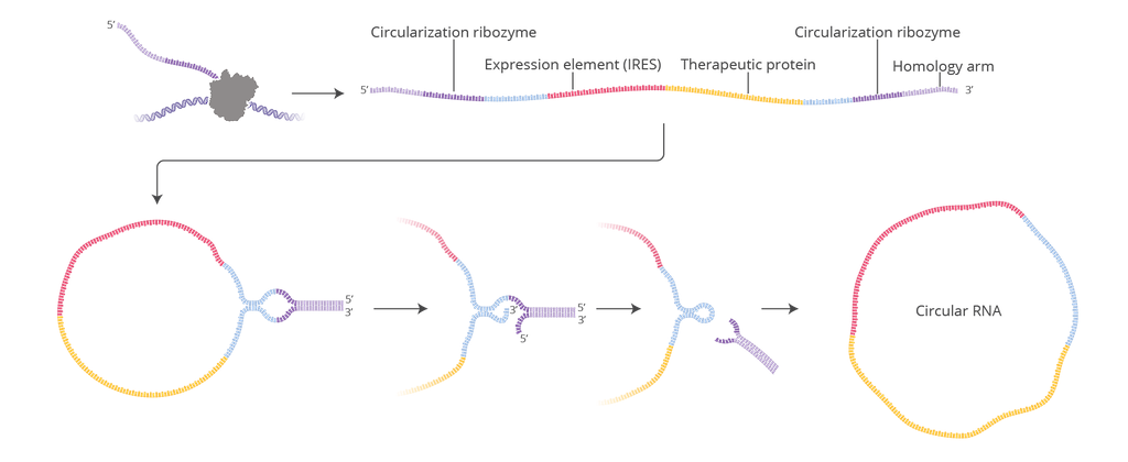 环形RNA(circRNA)是一种在哺乳动物细胞中天然存在的RNA。它们通过RNA前体的不同剪接方式而生成。科学家们发现,在环形RNA中加入病毒RNA中负责启动蛋白合成的IRES序列,可以让环形RNA与核糖体结合,启动蛋白合成。
