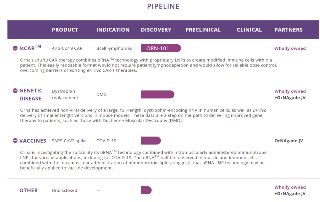 两家公司将共同开发“多种”项目并将其商业化,包括针对传染病和癌症的疫苗和疗法。Orna 将保留其 oRNA-LNP 技术平台的权利,并将继续推进肿瘤学和遗传疾病等领域的其他全资项目。