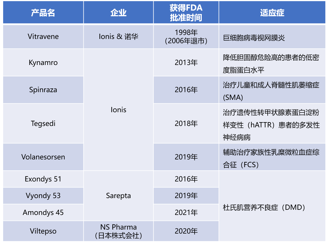 反义寡核苷酸(ASOs):共9款获批,Ionis、Sarepta占多数