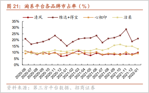 如果说从整体份额上,维达国际与恒安国际双方呈现出紧密纠缠的局势,那么在电商渠道上,维达国际绝对算得上一骑绝尘的存在。