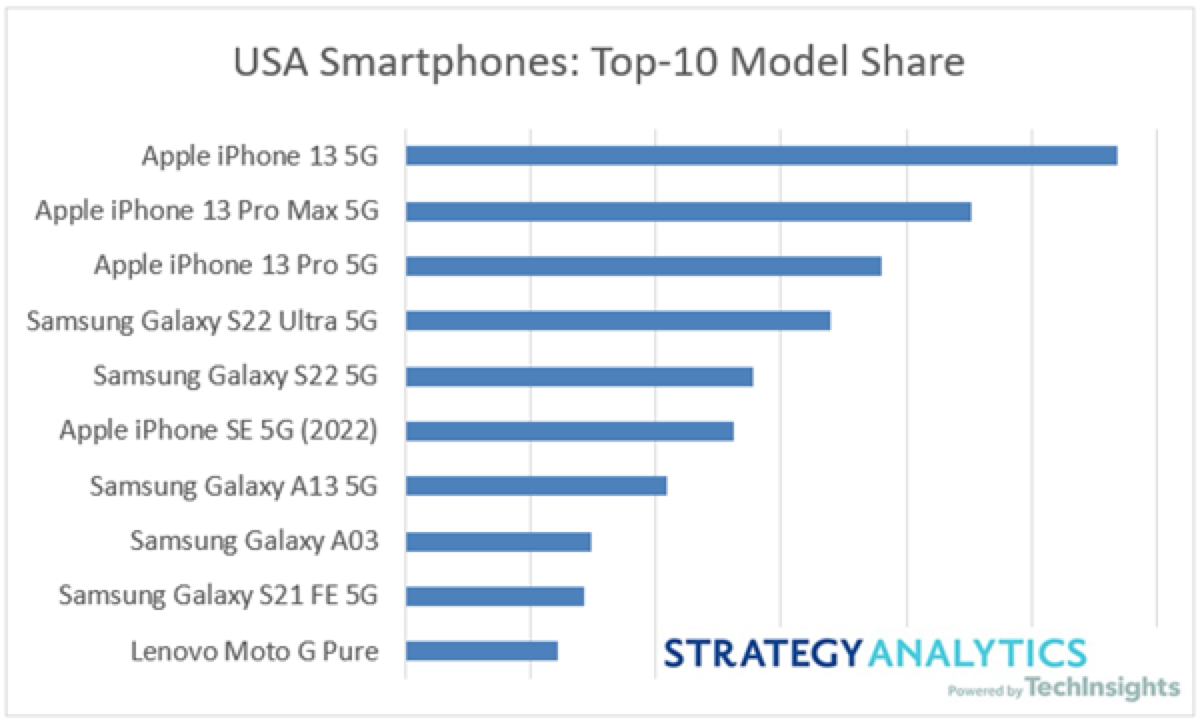 8月18日,StrategyAnalytics发布二季度美国畅销智能手机机型排名:苹果和三星在最畅销的10款智能手机中分别占4款及5款。联想-摩托罗拉G Pure是唯一一款进入美国前10的非苹果、三星机型,该厂商还有4款机型进入前20名。