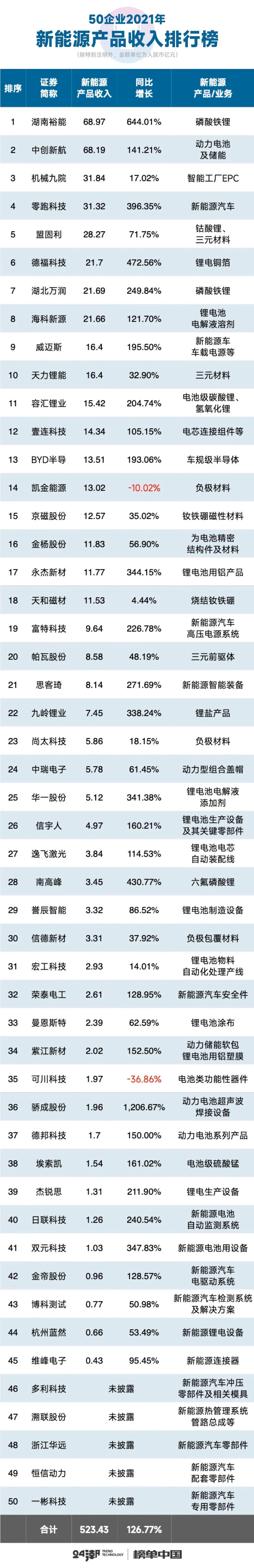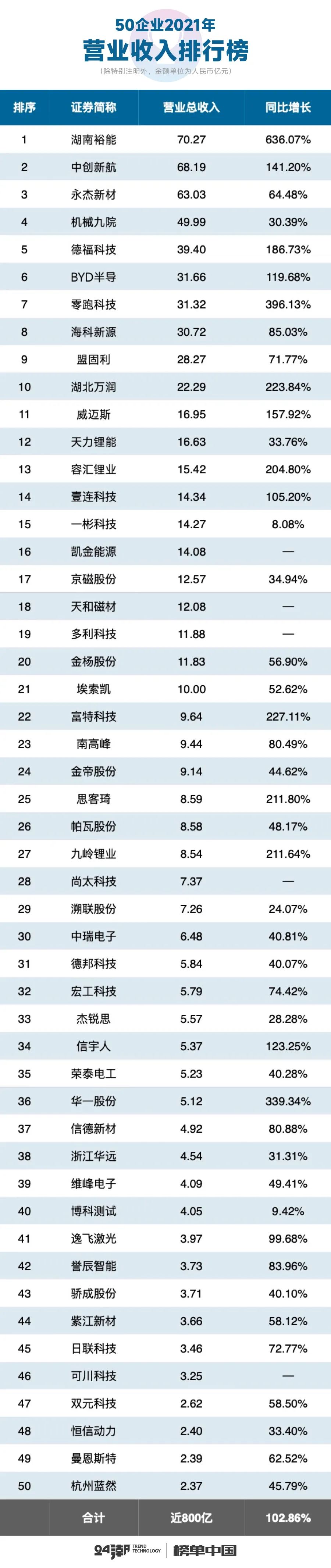 首先在整体营收层面,2021年50家新能源企业合计创收近800亿元,约同比增长了102.86%。其中21家企业营收规模在10亿元以上,15家企业营收增幅在100%以上,增长最快的三家企业依次为湖南裕能-增长636.07%、零跑科技-增长396.13%、华一股份-增长339.34%。