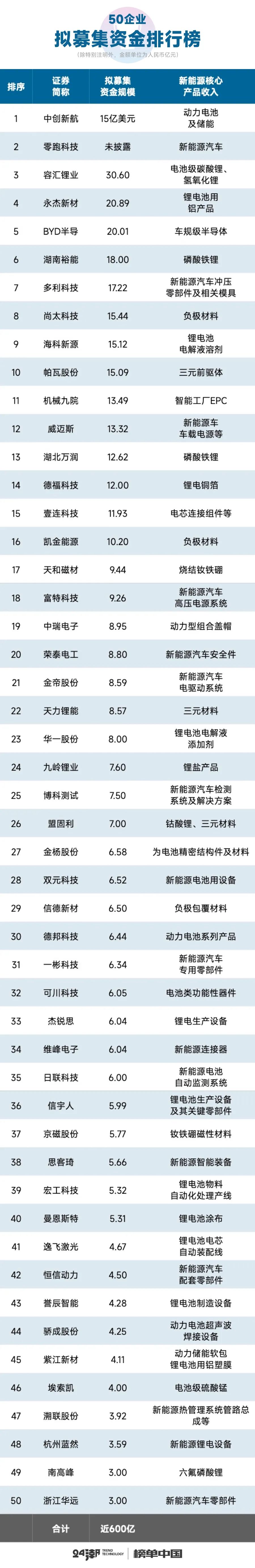 具体到企业层面,其中16家企业计划募集资金规模在10亿元以上,中创新航与零跑科技高居融资榜前两位。