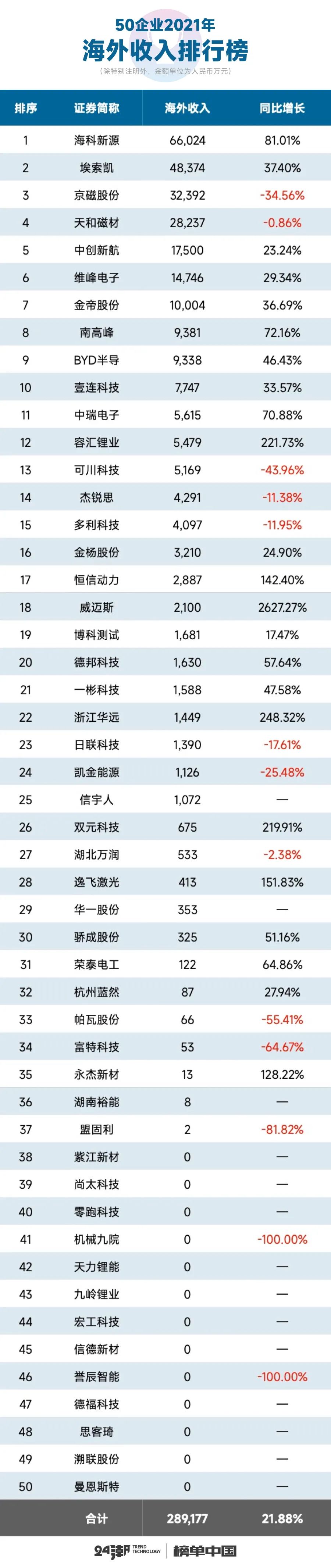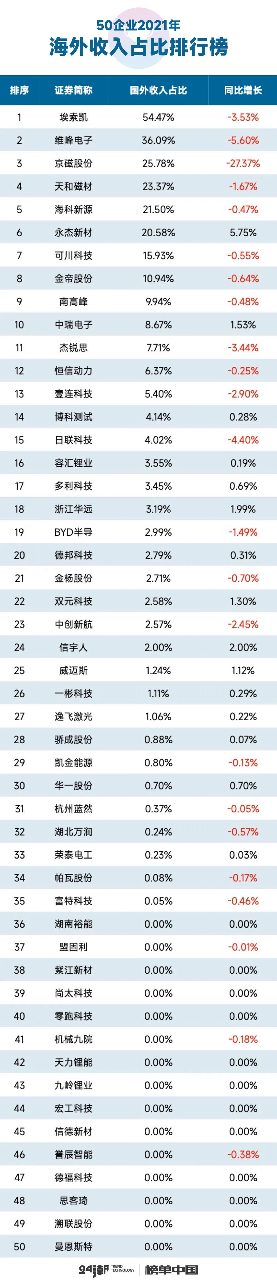 不过,笔者统计数据发现,这50家企业收入主要还是来自国内,海外扩张不尽如意。比如2021年这50家企业海外收入合计约为28.92亿元,仅同比增长21.88%,占营业收入比例仅为3.75%。