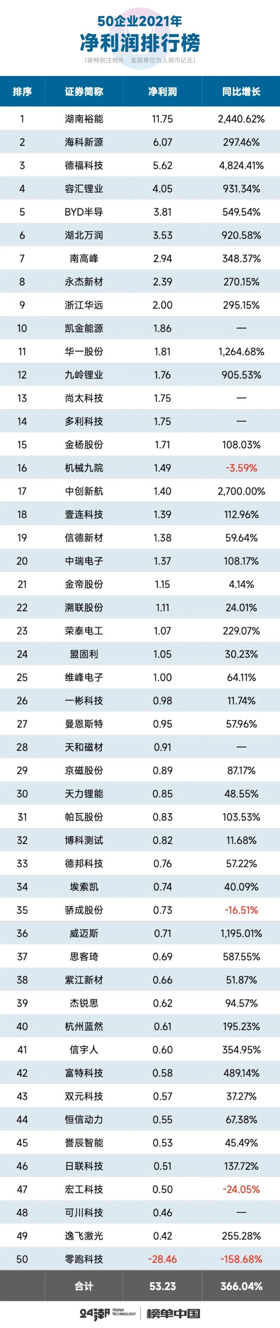 在盈利层面,2021年50家企业净利润实现了更快速的增长。据24潮统计,2021年50家企业整体实现净利润53.23亿元,同比增长了366.04%。