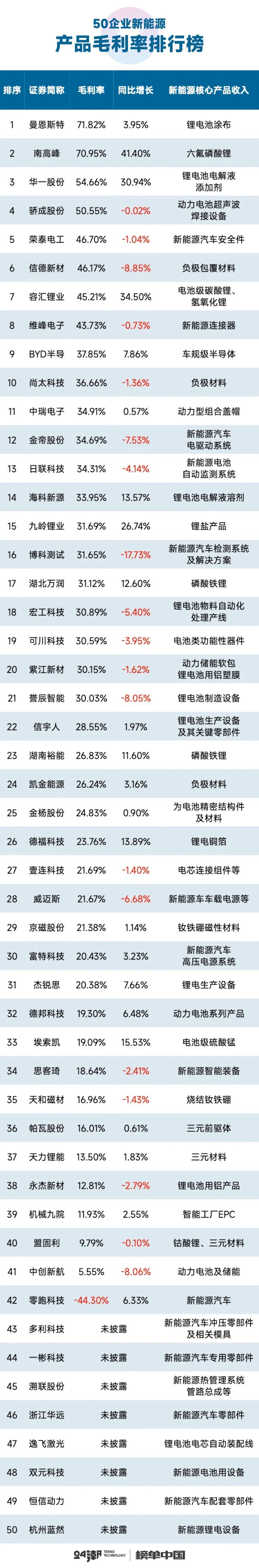 从新能源产品盈利角度看,21家企业新能源产品毛利率在30%以上,前三名依次为曼恩斯特-毛利率71.82%、南高峰-毛利率41.40%、华一股份-毛利率54.66%,三者新能源主营产品分别为锂电池涂布、六氟磷酸锂、锂电池电解液添加剂。