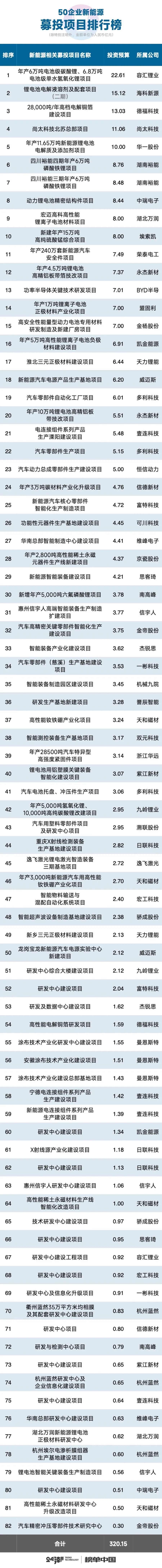 根据已披露的募投项目资料:只有5个项目的投资预算在10亿元以上,前三大募投项目投资领域分别为碳酸锂、锂电池电解液溶剂和高档电解铜箔,分属于容汇锂业、海科新源和德福科技。