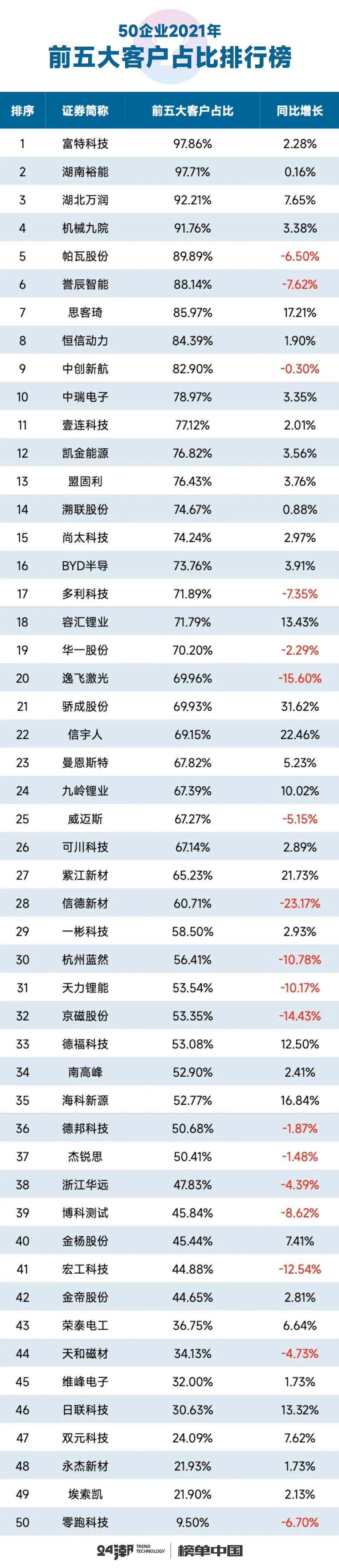 24潮统计数据发现,50家新能源企业中大多数企业存在大客户依赖现象及风险。如下表所示,2021年36家新能源企业前五大客户销售占比在50%以上,其中19家企业前五大客户销售占比在70%以上,前四家企业销售占比均在90%以上。