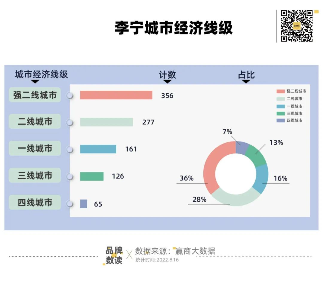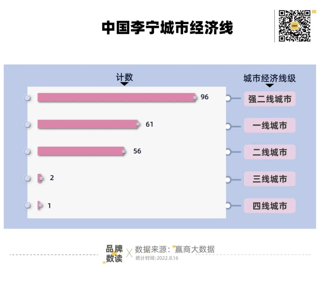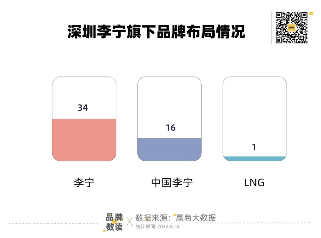 品牌数读比较发现,在城市选择上,上海、北京、深圳依然是李宁的战略腹地,包括旗下所有品牌购物中心门店数分别为78家、68家和51家。