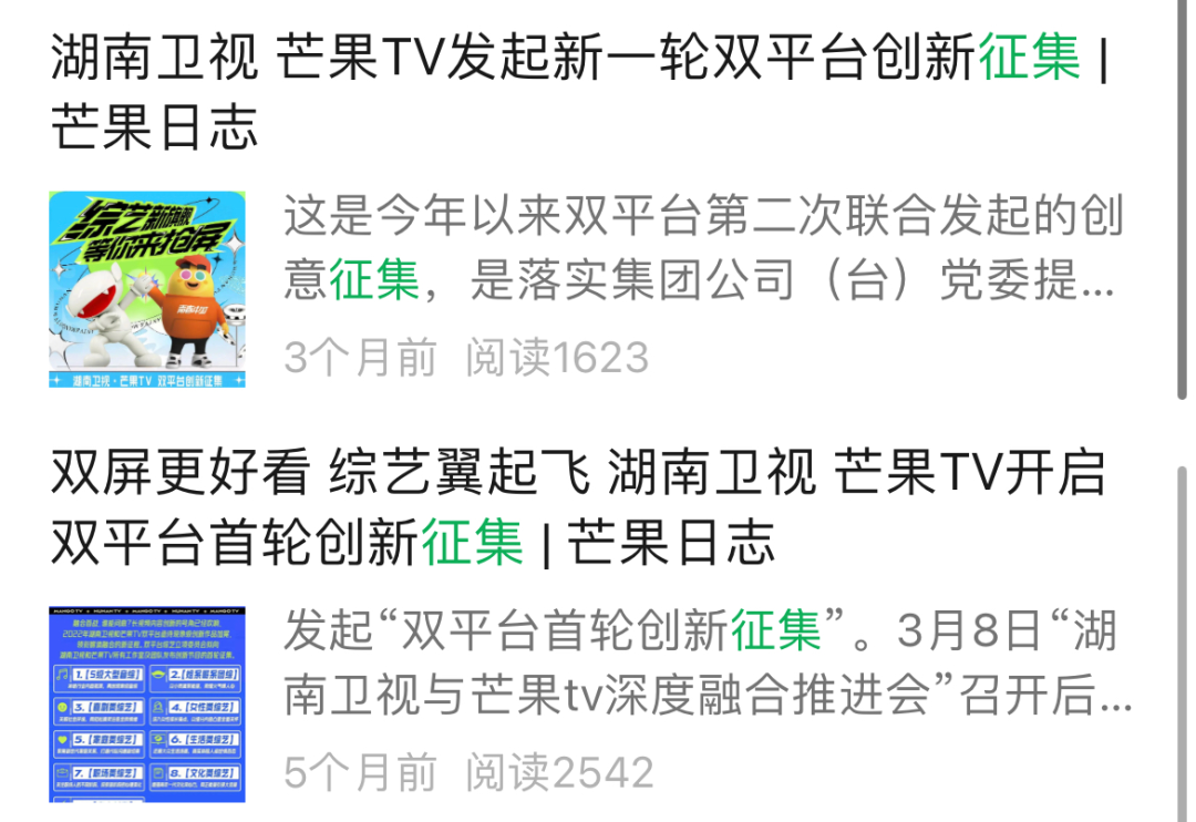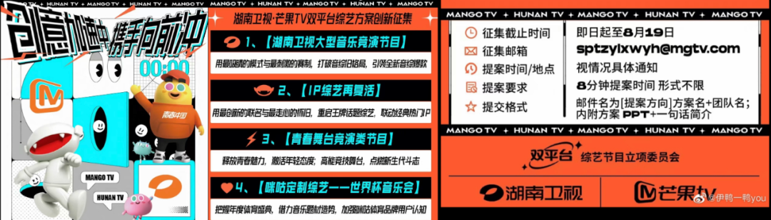 为此,行业各平台迎难而上,开始基于B端开发视角思考综艺创制新路,前段抖音的《百川综艺季》便是其中一例。而双芒作为“不创新,毋宁死”精神的长期贯彻者,从初步整合的去年到走向正轨的今年,已经7次(今年第3次)公开征集创新综艺方案,足见其对内容创意灵活度的看重。
