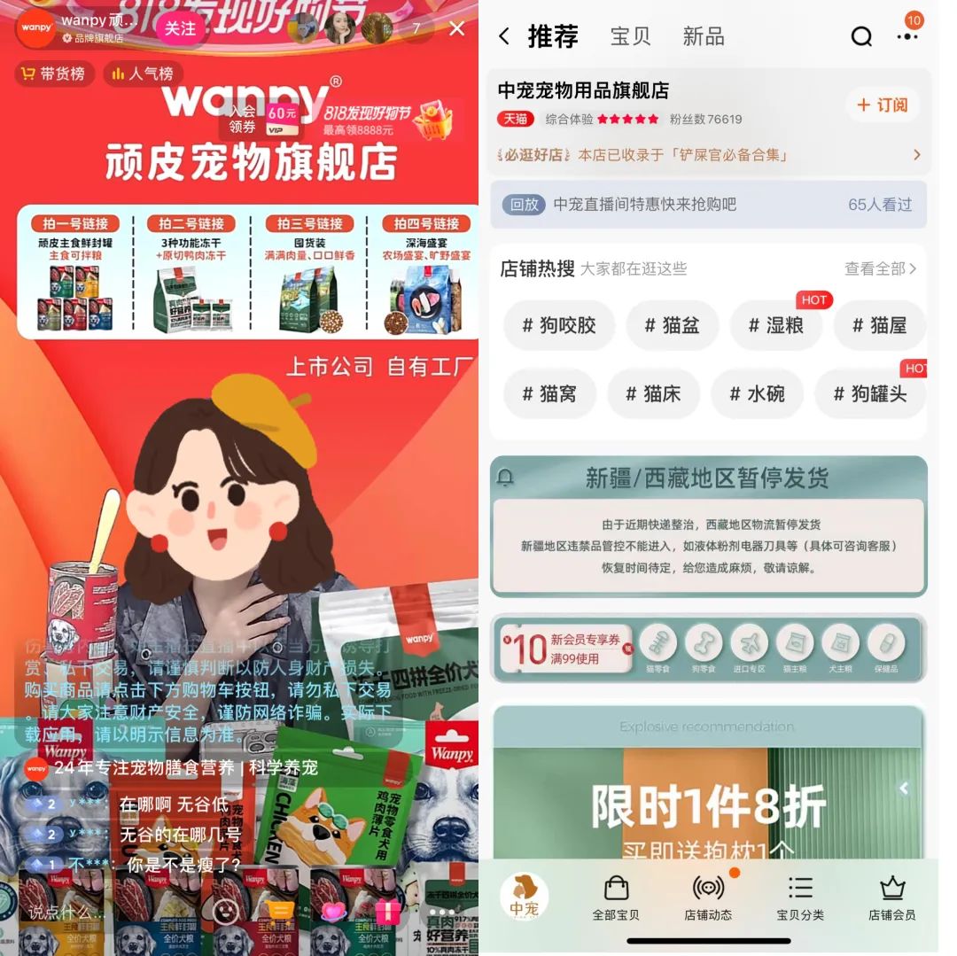 8月16日,《宠业光年》打开天猫“中宠宠物用品旗舰店”,页面显示该店铺粉丝7W+,近一次中宠直播间仅有65人看过。抖音上,拥有16.6万粉丝的“Wanpy顽皮宠物旗舰店”,当天下午某时段直播间内人数仅有7人。